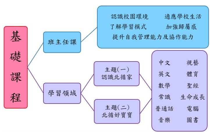 • 班主任課:於小一新生適應日及開課首三天由班主任施教,並由副班主任協助,主要目的是讓學生對小學生活有基本的認識。